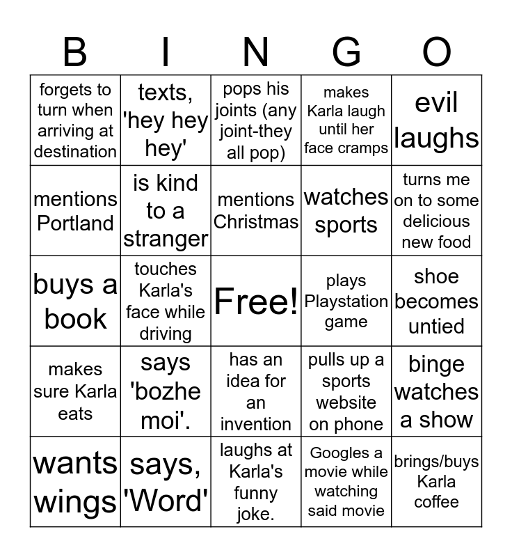 This bingo card has a free space and 24 words: says 'bozhe moi'., says, 'Word', mentions Christmas, wants wings, evil laughs, forgets to turn when arriving at destination, mentions Portland, texts, 'hey hey hey', plays Playstation game, has an idea for an invention, watches sports, buys a book, pulls up a sports website on phone, binge watches a show, is kind to a stranger, Googles a movie while watching said movie, shoe becomes untied, pops his joints (any joint-they all pop), turns me on to some delicious new food, touches Karla's face while driving, brings/buys Karla coffee, makes sure Karla eats, makes Karla laugh until her face cramps and laughs at Karla's funny joke..