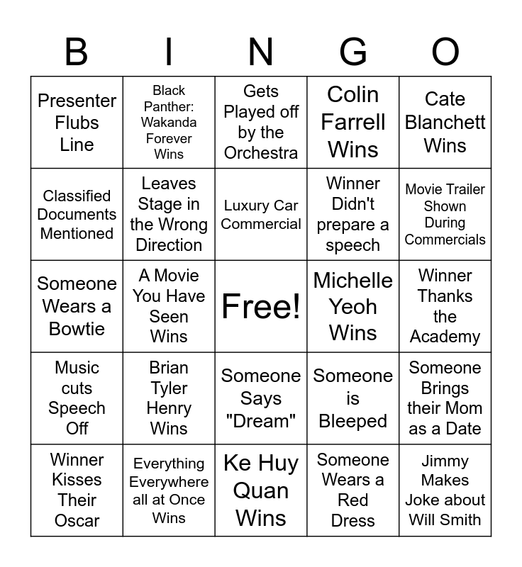 This bingo card has a free space and 107 words: "When I saw the Script...", 4+ People on stage to Accept Award, A Movie You Have Seen Wins, A Movie You Haven't Seen Wins, A Winner has Won Before, Action Movie Wins an Award, Adjust Gown Before Speaking, All Quiet on the Western Front Wins, Ana de Armas Wins, Angela Bassett Wins, Announcer can't Pronounce Name, Austin Butler Wins, Avatar: Way of Water Wins an Award, Babylon Wins an Award, Barry Keoghan wins, Bill Nighy Wins, Black Panther: Wakanda Forever Wins, Breaks a Record, Brendan Fraser Wins, Brendan Gleeson Wins, Brian Tyler Henry Wins, Caleb Takes a photo, Camera Cuts to Colin Farrell, Camera Cuts to Ryan Reynolds, Camera Cuts to the Wrong Person, Cate Blanchett Wins, Classified Documents Mentioned, Colin Farrell Wins, COVID-19 Mentioned, Donald Trump is Mentioned, Elvis Wins an Award, Everything Everywhere all at Once Wins, First Time Winner, Foreign Accent, Forgets to Thank Someone, Gets Played off by the Orchestra, Hong Chau Wins, Host Makes a Corny Joke, Jamie Lee Curtis Wins, Jimmy Makes Joke about Will Smith, Joke About Someone Sitting in Front Row, Judd Hirsch Wins, Ke Huy Quan Wins, Kerry Condon Wins, Lady Gaga Performs, Leaves Stage in the Wrong Direction, Legendary Actress/Actor Makes Appearance, Luxury Car Commercial, Michelle Williams Wins, Michelle Yeoh Wins, Movie Remake Wins Award, Movie Trailer Shown During Commercials, Music cuts Speech Off, New Hollywood Couple on Camera, Paul Mescal Wins, Perfume Commercial Airs, Pinocchio Wins, Political Message in Speech, Praising Other Nominees on Their Performance, Presenter Flubs Line, Presenter Has Trouble Opening Envelope, RRR Wins an Award, Saying They don't have A Prepared Speech, Saying They Will Forget to Thank someone in Their Speech, Says "I Love You" to Somebody, Show Goes Over Scheduled Time, Someone Brings their Best Friend as a Date, Someone Brings their Mom as a Date, Someone Cries, Someone is Bleeped, Someone Says "Dream", Someone Wears a Bowtie, Someone Wears a Red Dress, Someone Wears a White Suit, Someone Wears Sunglasses Indoors, Something Unexpected Happens, Speech Under 1 Minute, Standing Ovation, Stephanie Hsu Wins, Steven Spielberg Wins, Talks About the Importance of Movies, Tár Wins and Award, Technical Difficulty, Thanks Netflix in Speech, Thanks Parents in speech, The Banshees of Inısherin Wins, The Batman Wins, The Fablemans Wins, Top Gun: Maverick Wins an Award, Triangle of Sadness Wins, Winner Didn't prepare a speech, Winner Gets Played Off, Winner Has Already Won an Award Tonight, Winner Holds Oscar over Head with One Arm, Winner Holds Oscar with Both Hands, Winner Kisses Their Date, Winner Kisses Their Oscar, Winner Mentions Children by Name, Winner not There to Accept, Winner Puts on Glasses, Winner Reads Hand Written Speech, Winner Says She/He didn't Expect to Win, Winner Thanks Agent, Winner Thanks God, Winner Thanks Their Spouse, Winner Thanks the Academy and Woman Talking Wins.