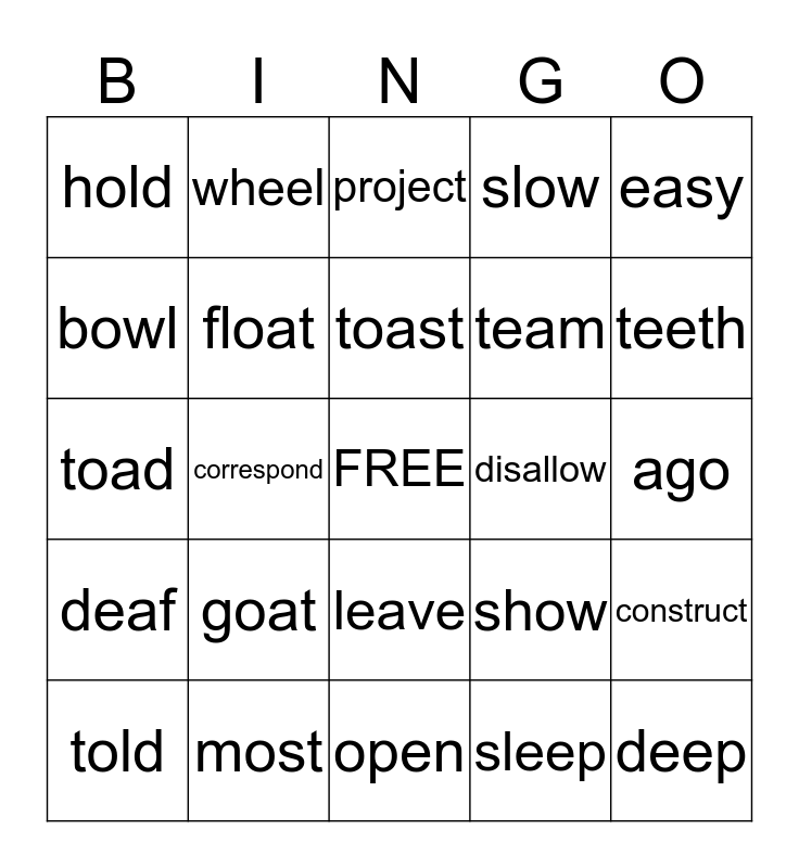 This bingo card has a free space and 24 words: goat, most, toast, told, easy, hold, bowl, wheel, disallow, leave, team, toad, show, construct, float, sleep, ago, project, teeth, correspond, deep, deaf, slow and open.