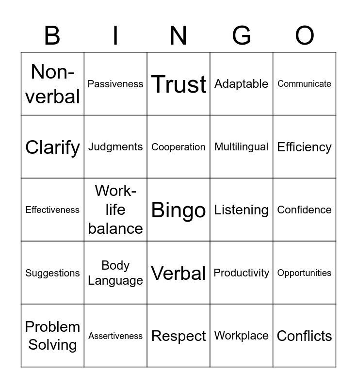 This bingo card has a free space and 24 words: Body Language, Assertiveness, Cooperation, Problem Solving, Communicate, Non-verbal, Clarify, Passiveness, Listening, Verbal, Multilingual, Effectiveness, Productivity, Opportunities, Judgments, Workplace, Confidence, Trust, Efficiency, Work-life balance, Conflicts, Suggestions, Adaptable and Respect.