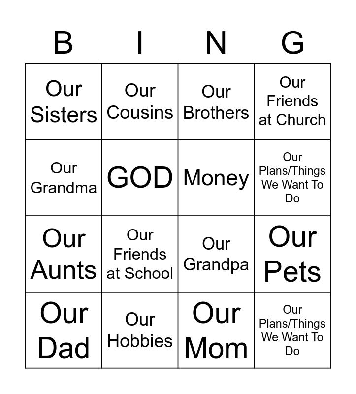 This bingo card has 17 words: Our Mom, Our Dad, Our Brothers, Our Sisters, Our Friends at School, Our Friends at Church, Our Pets, Money, Our Plans/Things We Want To Do, GOD, Our Hobbies, Our Grandpa, Our Grandma, Our Cousins, Our Aunts, Our Uncles and Our Plans/Things We Want To Do.