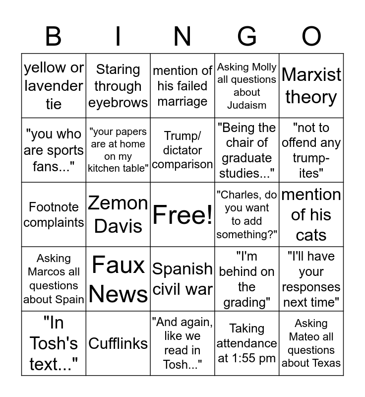 This bingo card has a free space and 24 words: Faux News, Cufflinks, Trump/ dictator comparison, "In Tosh's text...", Marxist theory, yellow or lavender tie, "you who are sports fans...", Staring through eyebrows, "Charles, do you want to add something?", Spanish civil war, "Being the chair of graduate studies...", Footnote complaints, "I'm behind on the grading", "I'll have your responses next time", "your papers are at home on my kitchen table", Taking attendance at 1:55 pm, mention of his cats, mention of his failed marriage, "not to offend any trump-ites", Zemon Davis, Asking Mateo all questions about Texas, Asking Marcos all questions about Spain, Asking Molly all questions about Judaism and "And again, like we read in Tosh...".