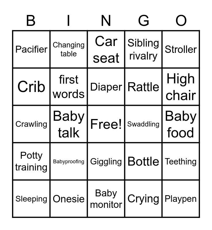 This bingo card has a free space and 26 words: Giggling, Crying, Diaper, Onesie, Stroller, Pacifier, Crib, Changing table, Baby food, Bottle, Rattle, Crawling, Teething, Sleeping, Baby talk, Maternity leave, Sibling rivalry, Potty training, Car seat, Playpen, High chair, Baby monitor, Swaddling, Babyproofing, first words and First steps.