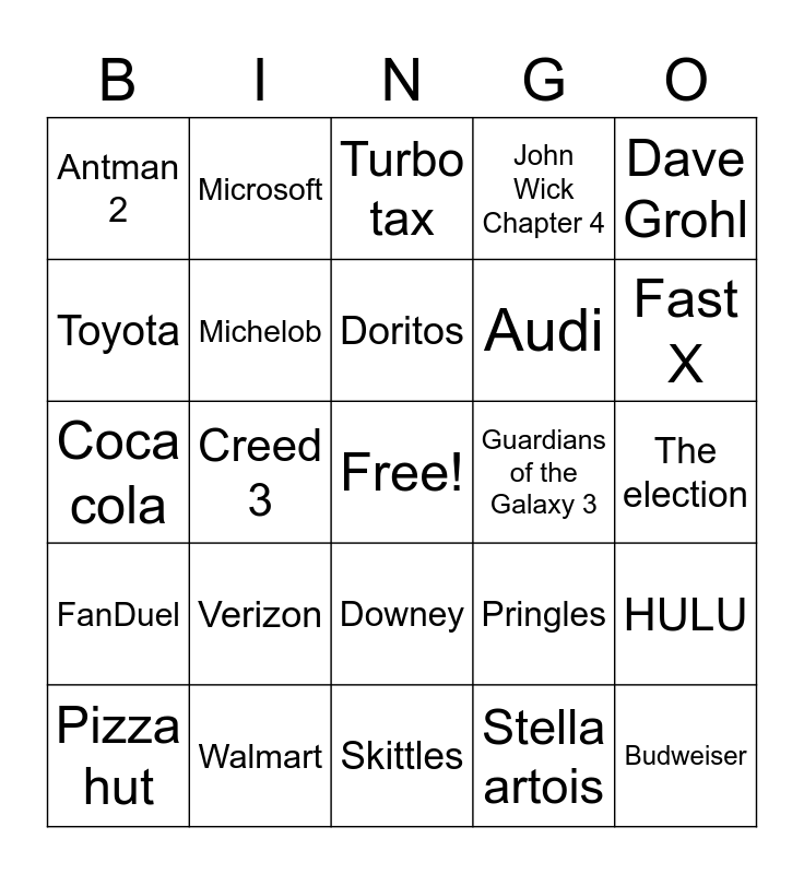 This bingo card has a free space and 36 words: Workday, Heineken, M&M, Michelob, Pringles, FanDuel, Doritos, PopCorners, Dave Grohl, Kevin Bacon, Creed 3, John Wick Chapter 4, Super Mario Bros, Guardians of the Galaxy 3, Fast X, Antman 2, Olay, Verizon, Budweiser, Turbo tax, The election, HULU, Walmart, Pizza hut, Skittles, Microsoft, Coca cola, Skechers, Audi, Toyota, Amazon, Mercedes Benz, Stella artois, Downey, The Little Mermaid and Crown royal.