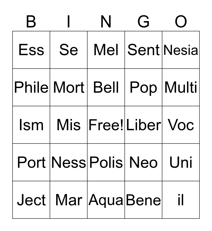 This bingo card has a free space and 24 words: Ness, Mar, Bell, Ject, Nesia, Ess, Phile, Se, Liber, Polis, Pop, Ism, Neo, Uni, Mort, Bene, Voc, Mel, Multi, Mis, il, Port, Sent and Aqua.
