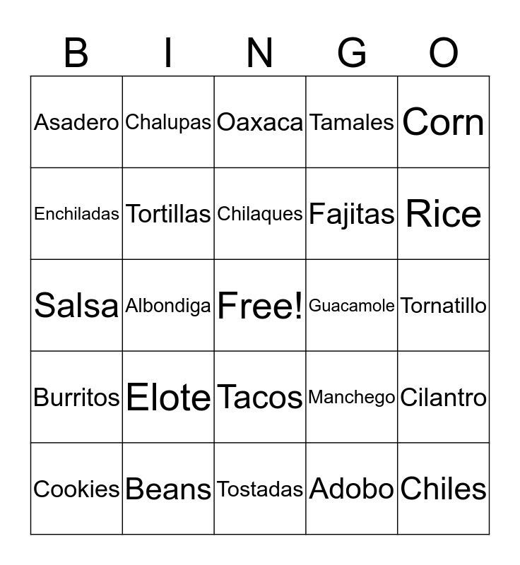 This bingo card has a free space and 25 words: Elote, Tostadas, Chilaques, Cookies, Corn, Asadero, Enchiladas, Chalupas, Guacamole, Tacos, Fajitas, Salsa, Manchego, Cilantro, Tortillas, Quesadillas, Tornatillo, Oaxaca, Rice, Albondiga, Chiles, Beans, Burritos, Tamales and Adobo.