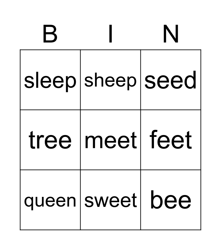 This bingo card has a free space and 8 words: feet, seed, sheep, queen, sleep, bee, tree and sweet.