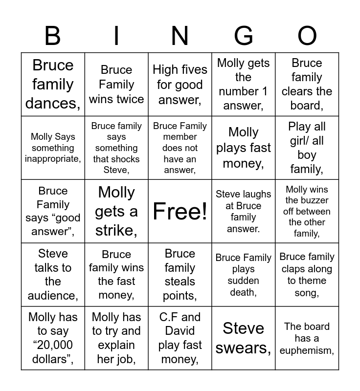 This bingo card has a free space and 24 words: Bruce family wins the fast money,, Molly has to try and explain her job,, Bruce Family member does not have an answer,, Molly has to say “20,000 dollars”,, Bruce family clears the board,, Bruce family dances,, Molly Says something inappropriate,, Bruce Family wins twice, Steve laughs at Bruce family answer., Bruce family steals points,, Molly plays fast money,, Bruce Family says “good answer”,, Bruce Family plays sudden death,, Bruce family claps along to theme song,, Bruce family says something that shocks Steve,, Steve swears,, Molly wins the buzzer off between the other family,, High fives for good answer,, Play all girl/ all boy family,, Molly gets a strike,, The board has a euphemism,, Steve talks to the audience,, Molly gets the number 1 answer, and C.F and David play fast money,.