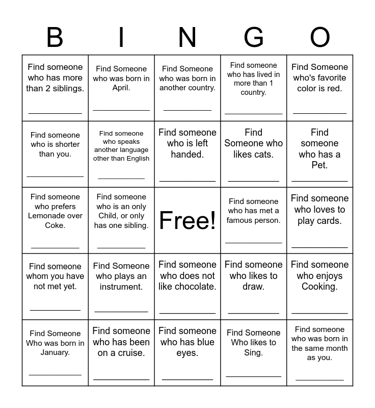 This bingo card has a free space and 25 words: Find Someone Who was born in January. ____________, Find Someone who plays an instrument. ___________, Find someone who is left handed. ___________, Find Someone Who likes to Sing. ____________, Find someone who has a Pet. ___________, Find someone who has more than 2 siblings. ___________, Find Someone who was born in April. _____________, Find Someone who was born in another country. ___________, Find Someone who likes cats. __________, Find someone who enjoys Cooking. ___________, Find someone who prefers Lemonade over Coke. ___________, Find someone who speaks another language other than English ____________, Find someone who likes to draw. __________, Find someone who was born in the same month as you. ___________, Find someone who is shorter than you. _____________, Find someone who has been on a cruise. ___________, Find someone who has blue eyes. __________, Find someone who has lived in more than 1 country. ______________, Find someone who loves to play cards. ___________, Find someone whom you have not met yet. ___________, Find someone who is an only Child, or only has one sibling. ___________, Find someone who does not like chocolate. ___________, Find someone who has met a famous person. _____________, Find Someone who's favorite color is red. ___________ and Find someone who is wearing a blue shirt. ____________.