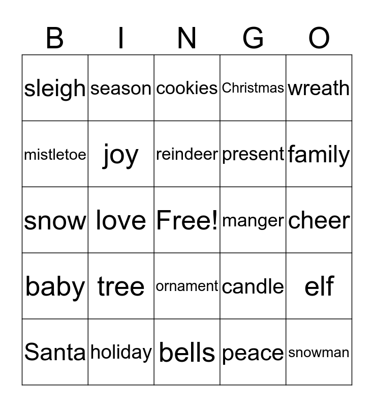This bingo card has a free space and 24 words: tree, holiday, reindeer, Santa, wreath, sleigh, mistletoe, season, manger, ornament, present, snow, candle, elf, joy, peace, cheer, cookies, family, love, snowman, baby, Christmas and bells.
