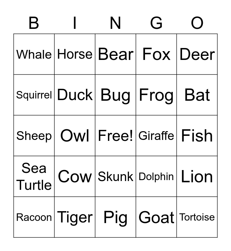 This bingo card has a free space and 35 words: Turkey, Dog, Rabbit, Duck, Skunk, Fox, Squirrel, Ant, Bug, Mosquito, Sheep, Deer, Moose, Bee, Whale, Giraffe, Goat, Owl, Sea Turtle, Tortoise, Dolphin, Racoon, Lion, Tiger, Bear, Bat, Mouse, Rat, Frog, Fish, Caterpillar, Pig, Cow, Horse and Donkey.
