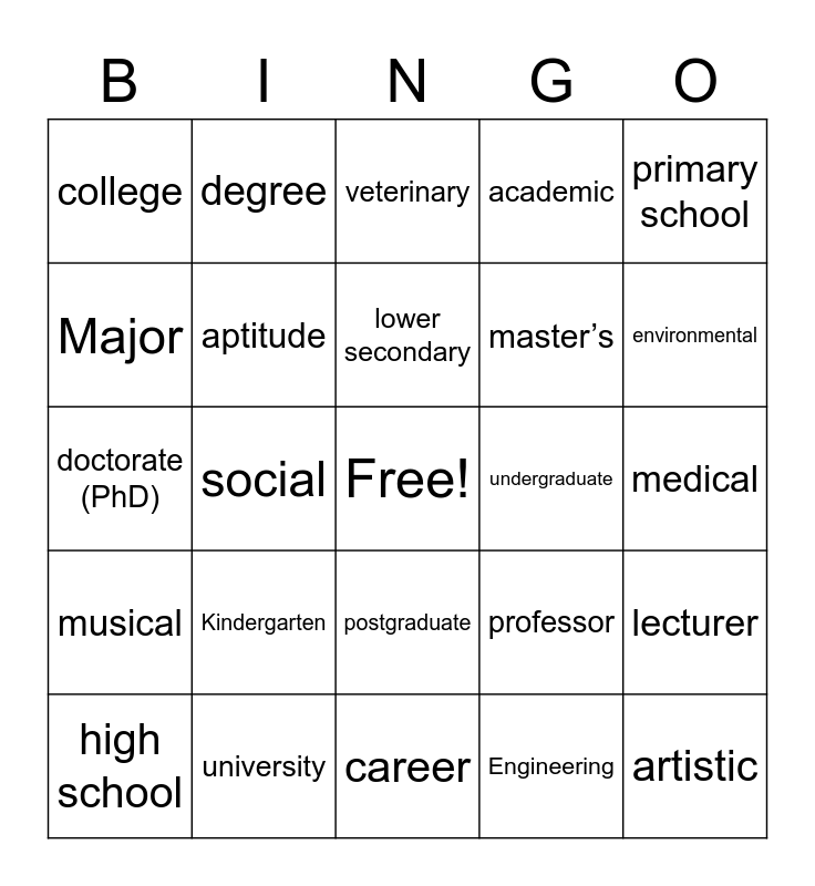 This bingo card has a free space and 24 words: Kindergarten, university, lower secondary, high school, primary school, college, Major, degree, undergraduate, postgraduate, master’s, doctorate (PhD), professor, lecturer, aptitude, Engineering, medical, veterinary, environmental, social, artistic, musical, academic and career.