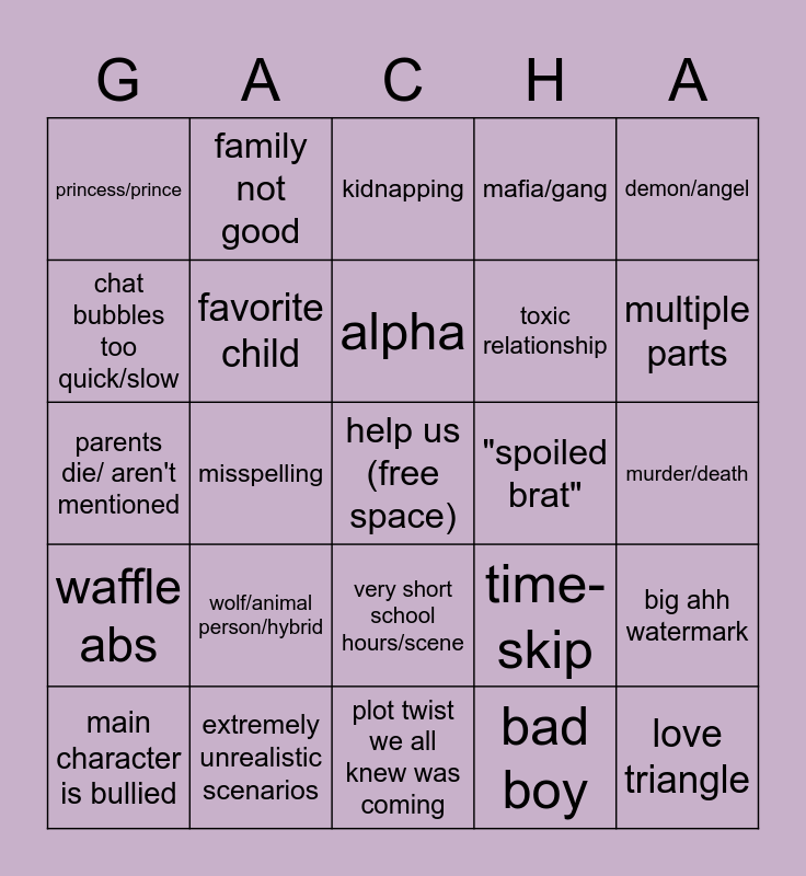This bingo card has a free space and 24 words: main character is bullied, wolf/animal person/hybrid, alpha, bad boy, demon/angel, princess/prince, family not good, kidnapping, "spoiled brat", murder/death, parents die/ aren't mentioned, favorite child, time-skip, big ahh watermark, chat bubbles too quick/slow, extremely unrealistic scenarios, plot twist we all knew was coming, mafia/gang, multiple parts, waffle abs, misspelling, very short school hours/scene, toxic relationship and love triangle.