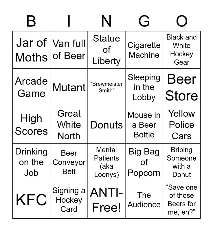 This bingo card has 31 words: ANTI-Free!, Burp, Great White North, Drinking Beer, Jar of Moths, Statue of Liberty, Mutant, Big Bag of Popcorn, Mouse in a Beer Bottle, The Audience, Yellow Police Cars, Donuts, “Save one of those Beers for me, eh?”, Dog Drinking Beer, Beer Store, Piano Keyboard, Bribing Someone with a Donut, Beer Conveyor Belt, Drinking on the Job, Mental Patients (aka Loonys), Black and White Hockey Gear, Lit Ip Wall Map, KFC, Van full of Beer, Sleeping in the Lobby, Arcade Game, Cigarette Machine, High Scores, Signing a Hockey Card, “Brewmeister Smith” and Pam fires Smith.