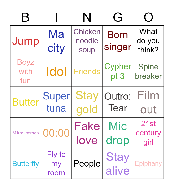 This bingo card has 25 words: 00:00, People, Friends, Butterfly, What do you think?, Jump, Boyz with fun, Ma city, Outro: Tear, Fake love, Cypher pt 3, Butter, Mic drop, 21st century girl, Idol, Epiphany, Film out, Chicken noodle soup, Spine breaker, Super tuna, Stay gold, Fly to my room, Mikrokosmos, Born singer and Stay alive.