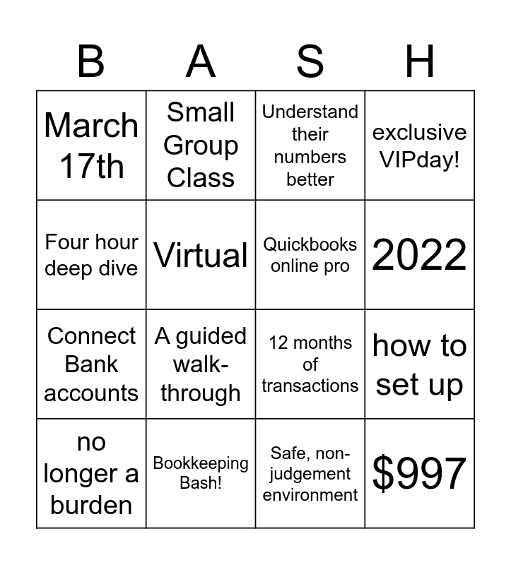 This bingo card has 24 words: 20+ years of experience, Female business owners, 2022, Taxes, Four hour deep dive, March 17th, Virtual, Small Group Class, Bookkeeping Bash!, Live Q& A, Connect Bank accounts, 12 months of transactions, Automated System, Reports, Quickbooks online pro, Have fun while bookkeeping, Safe, non- judgement environment, Understand their numbers better, A guided walk-through, how to set up, no longer a burden, $997, exclusive VIPday! and QuickBooks Phenom.