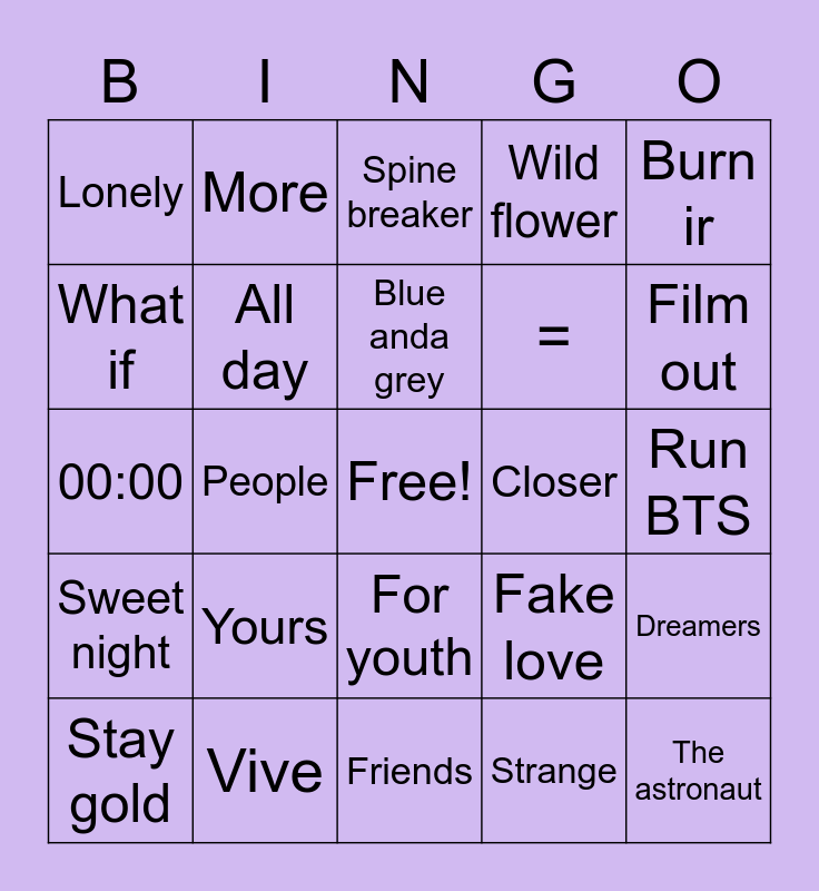 This bingo card has a free space and 25 words: Sweet night, Vive, Friends, Strange, Burn ir, Lonely, More, Spine breaker, Closer, Dreamers, What if, All day, Ugh!, Fake love, Film out, Stay gold, People, Blue anda grey, =, Run BTS, 00:00, Yours, For youth, Wild flower and The astronaut.