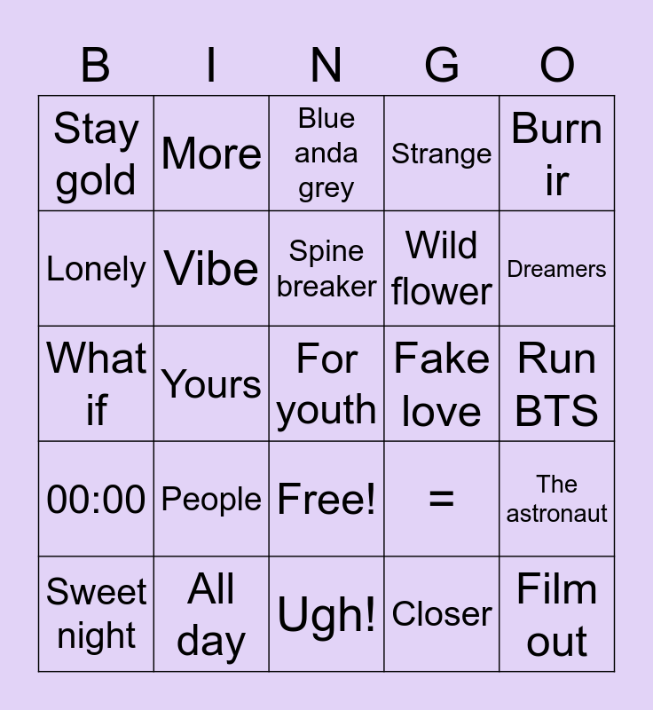 This bingo card has 26 words: Free!, Sweet night, Vibe, Friends, Strange, Burn ir, Lonely, More, Spine breaker, Closer, Dreamers, What if, All day, Ugh!, Fake love, Film out, Stay gold, People, Blue anda grey, =, Run BTS, 00:00, Yours, For youth, Wild flower and The astronaut.