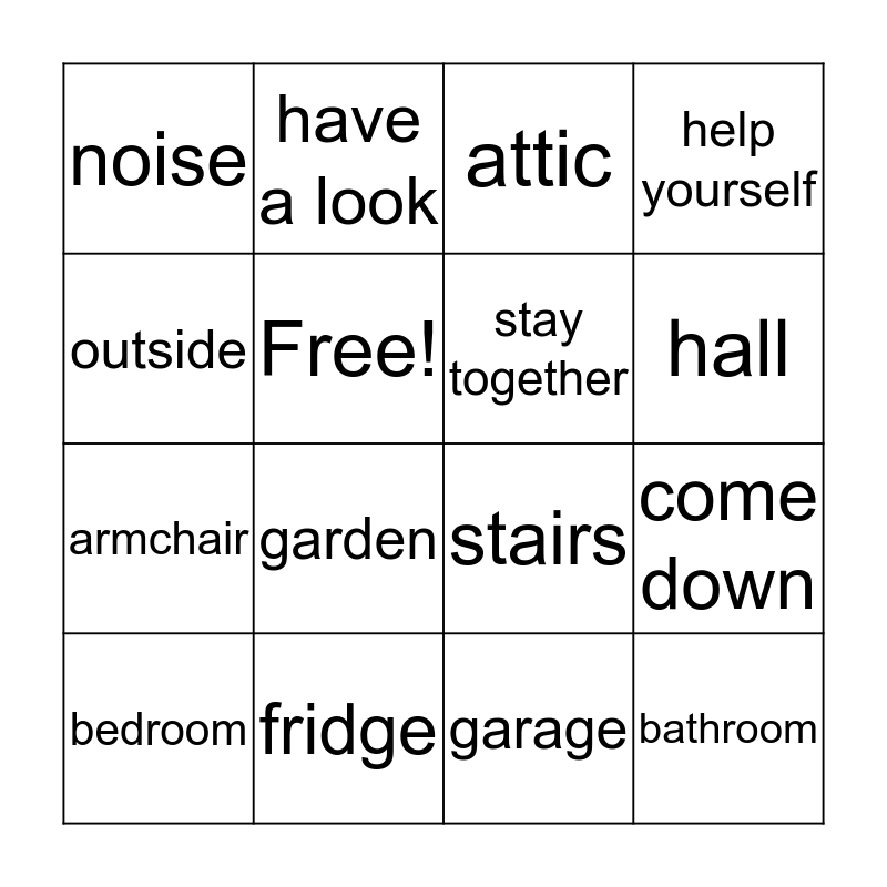 This bingo card has a free space and 15 words: bedroom, bathroom, attic, noise, hall, outside, garden, garage, Free!, armchair, come down, help yourself, stay together, have a look and fridge.