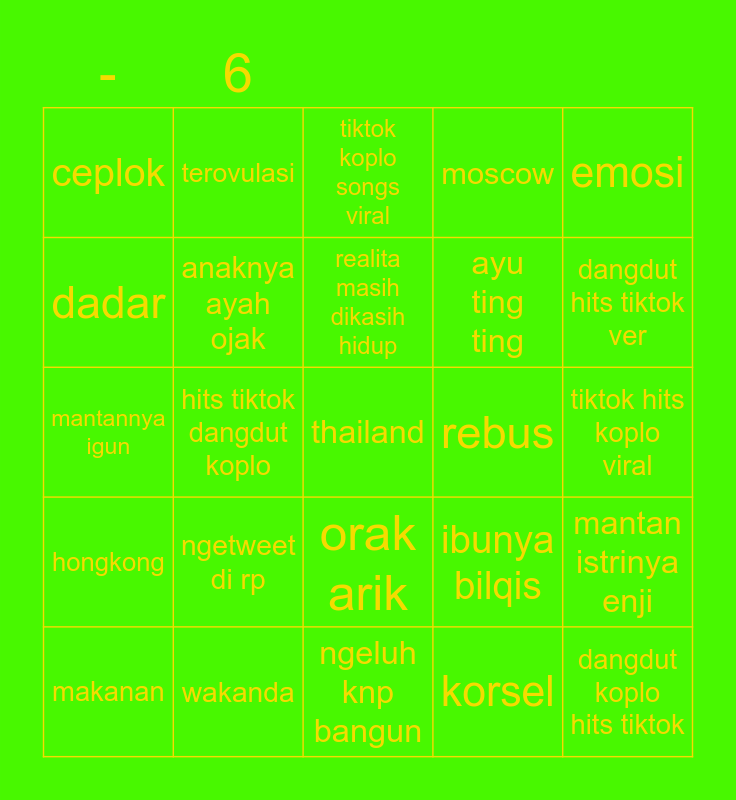 This bingo card has 25 words: ngetweet di rp, ngeluh knp bangun, realita masih dikasih hidup, makanan, emosi, ceplok, dadar, terovulasi, rebus, orak arik, ayu ting ting, mantannya igun, ibunya bilqis, mantan istrinya enji, anaknya ayah ojak, dangdut koplo hits tiktok, tiktok hits koplo viral, tiktok koplo songs viral, dangdut hits tiktok ver, hits tiktok dangdut koplo, thailand, wakanda, hongkong, moscow and korsel.