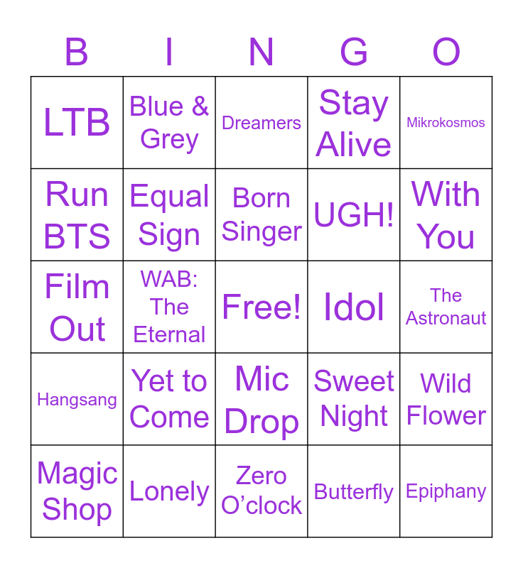 This bingo card has a free space and 25 words: Yet to Come, Zero O’clock, Born Singer, Magic Shop, Mikrokosmos, LTB, Run BTS, Blue & Grey, Idol, Mic Drop, UGH!, Film Out, Sweet Night, Wild Flower, Equal Sign, People, The Astronaut, Dreamers, With You, WAB: The Eternal, Epiphany, Lonely, Hangsang, Stay Alive and Butterfly.