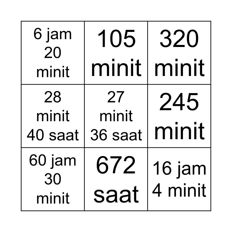 This bingo card has a free space and 8 words: 245 minit, 320 minit, 105 minit, 60 jam 30 minit, 6 jam 20 minit, 16 jam 4 minit, 28 minit 40 saat and 672 saat.