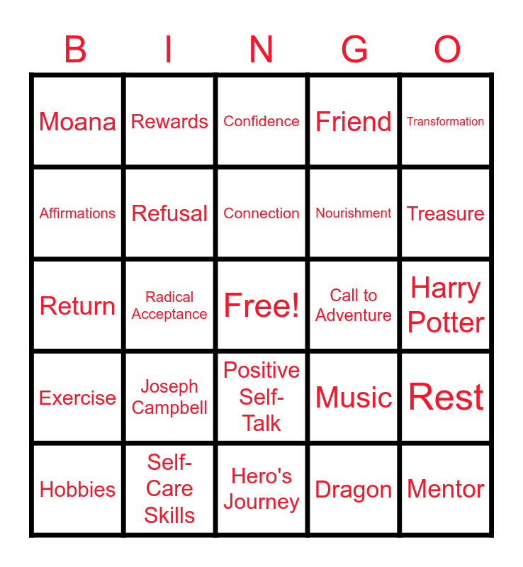 This bingo card has a free space and 25 words: Joseph Campbell, Hero's Journey, Connection, Hobbies, Transformation, Moana, Affirmations, Rewards, Call to Adventure, Positive Self-Talk, Nourishment, Return, Music, Rest, Refusal, Ordinary World, Harry Potter, Confidence, Treasure, Radical Acceptance, Mentor, Self-Care Skills, Exercise, Friend and Dragon.