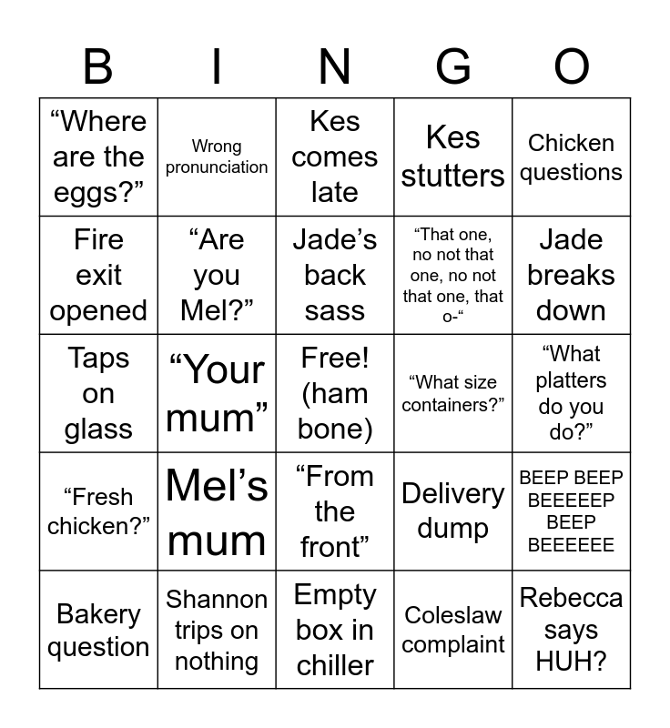 This bingo card has a free space and 24 words: Mel’s mum, Shannon trips on nothing, Jade’s back sass, Bakery question, Chicken questions, “Where are the eggs?”, Fire exit opened, Wrong pronunciation, “What size containers?”, “From the front”, “That one, no not that one, no not that one, that o-“, Taps on glass, Delivery dump, BEEP BEEP BEEEEEP BEEP BEEEEEE, “Are you Mel?”, Coleslaw complaint, “What platters do you do?”, Kes comes late, Jade breaks down, “Your mum”, Rebecca says HUH?, “Fresh chicken?”, Kes stutters and Empty box in chiller.