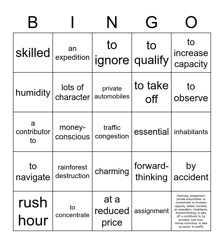 This bingo card has 26 words: charming, assignment, private automobiles, to concentrate, to increase capacity, skilled, humidity, an expedition, inhabitants, forward-thinking, to take off, a contributor to, by accident, rush hour, money-conscious, to take up space, to qualify, to navigate, to ignore, traffic congestion, to observe, at a reduced price, essential, rainforest destruction, lots of character and charming, assignment, private automobiles, to concentrate, to increase capacity, skilled, humidity, an expedition, inhabitants, forward-thinking, to take off, a contributor to, by accident, rush hour, money-conscious, to take up space, to qualify.