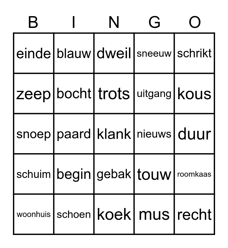 This bingo card has a free space and 44 words: huis, recht, baan, woonhuis, slaapt, mus, dweil, hangmat, schrikt, schoen, sneeuw, nieuws, gebak, begin, hoekje, koek, ring, snoep, keuze, kous, blauw, rijst, rijp, einde, reis, duur, zuur, kind, touw, schuim, schrift, roomkaas, broek, stout, paard, taart, maai, hooi, trots, zeep, uitgang, boompje, bocht and geel.