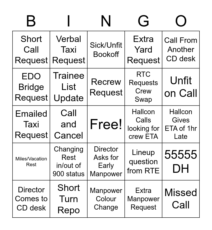 This bingo card has a free space and 24 words: Changing Rest in/out of 900 status, Short Turn Repo, Recrew Request, Director Comes to CD desk, Call From Another CD desk, Short Call Request, EDO Bridge Request, Verbal Taxi Request, Hallcon Calls looking for crew ETA, Director Asks for Early Manpower, RTC Requests Crew Swap, Emailed Taxi Request, Lineup question from RTE, 55555 DH, Trainee List Update, Extra Manpower Request, Hallcon Gives ETA of 1hr Late, Sick/Unfit Bookoff, Unfit on Call, Call and Cancel, Missed Call, Miles/Vacation Rest, Extra Yard Request and Manpower Colour Change.