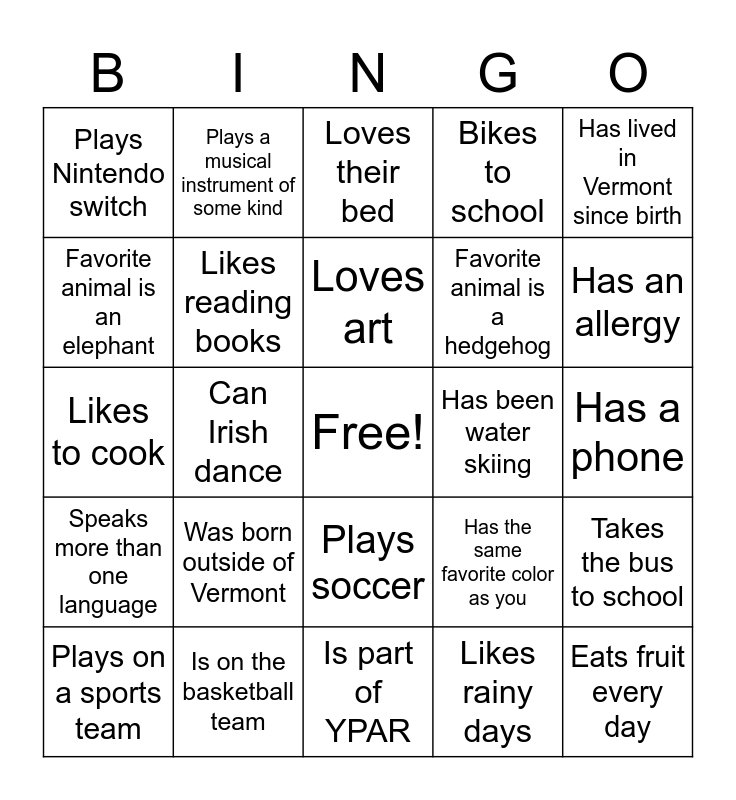 This bingo card has a free space and 30 words: Is on the basketball team, Does aerial sling, Can Irish dance, Has a cat, Plays Nintendo switch, Loves their bed, Likes reading books, Plays soccer, Has been water skiing, Is part of YPAR, Has a phone, Eats fruit every day, Likes rainy days, Has the same number of siblings as you, Has an allergy, Plays a musical instrument of some kind, Has the same favorite color as you, Speaks more than one language, Was born outside of Vermont, Has lived in Vermont since birth, Likes to cook, Walks to school, Plays a musical instrument of some kind, Favorite animal is a hedgehog, Favorite animal is an elephant, Bikes to school, Takes the bus to school, Plays on a sports team, Loves art and Loves playing video games.