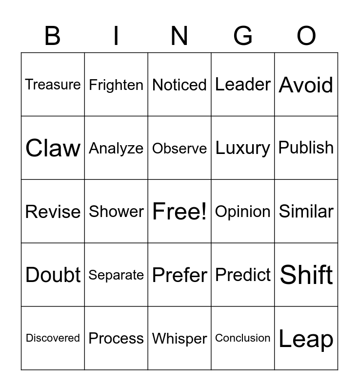 This bingo card has a free space and 34 words: Vanish, Conclusion, Accident, Demolish, Doubt, Analyze, Avoid, Discovered, Frighten, Include, Observe, Noticed, Necessary, Insist, Opinion, Publish, Process, Revise, Separate, Predict, Prefer, Volunteer, Treasure, Similar, Whisper, Leap, Leader, Chew, Luxury, Claw, Cheer, Shower, Shift and Shave.