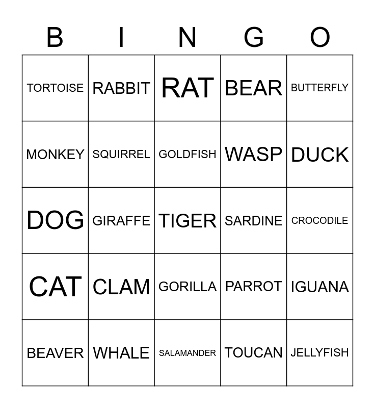This bingo card has 25 words: CLAM, SALAMANDER, GOLDFISH, BEAVER, BUTTERFLY, TORTOISE, MONKEY, RABBIT, SARDINE, GORILLA, WASP, DOG, PARROT, IGUANA, SQUIRREL, JELLYFISH, CROCODILE, RAT, DUCK, GIRAFFE, TIGER, WHALE, CAT, BEAR and TOUCAN.