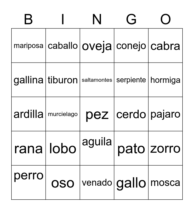 This bingo card has 25 words: lobo, venado, saltamontes, perro, cabra, mariposa, gallina, caballo, cerdo, aguila, serpiente, ardilla, pato, zorro, tiburon, mosca, pajaro, oveja, hormiga, murcielago, pez, oso, rana, conejo and gallo.