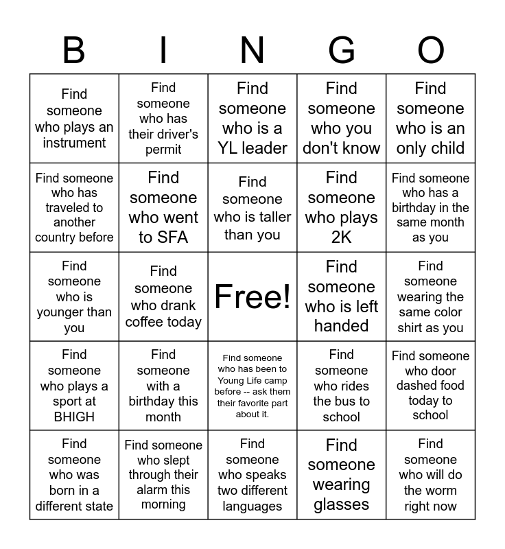 This bingo card has a free space and 24 words: Find someone with a birthday this month, Find someone who slept through their alarm this morning, Find someone who is taller than you, Find someone who was born in a different state, Find someone who is an only child, Find someone who plays an instrument, Find someone who has traveled to another country before, Find someone who has their driver's permit, Find someone who is left handed, Find someone who has been to Young Life camp before -- ask them their favorite part about it., Find someone who plays 2K, Find someone who is younger than you, Find someone who rides the bus to school, Find someone who door dashed food today to school, Find someone who went to SFA, Find someone wearing glasses, Find someone wearing the same color shirt as you, Find someone who is a YL leader, Find someone who has a birthday in the same month as you, Find someone who drank coffee today, Find someone who will do the worm right now, Find someone who plays a sport at BHIGH, Find someone who you don't know and Find someone who speaks two different languages.