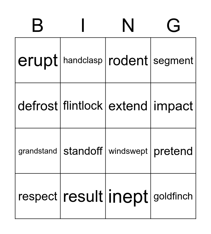 This bingo card has 20 words: pretend, protest, rodent, prevent, respect, defrost, result, erupt, grandstand, handclasp, standoff, windswept, flintlock, goldfinch, extend, extract, impact, segment, inept and Midwest.