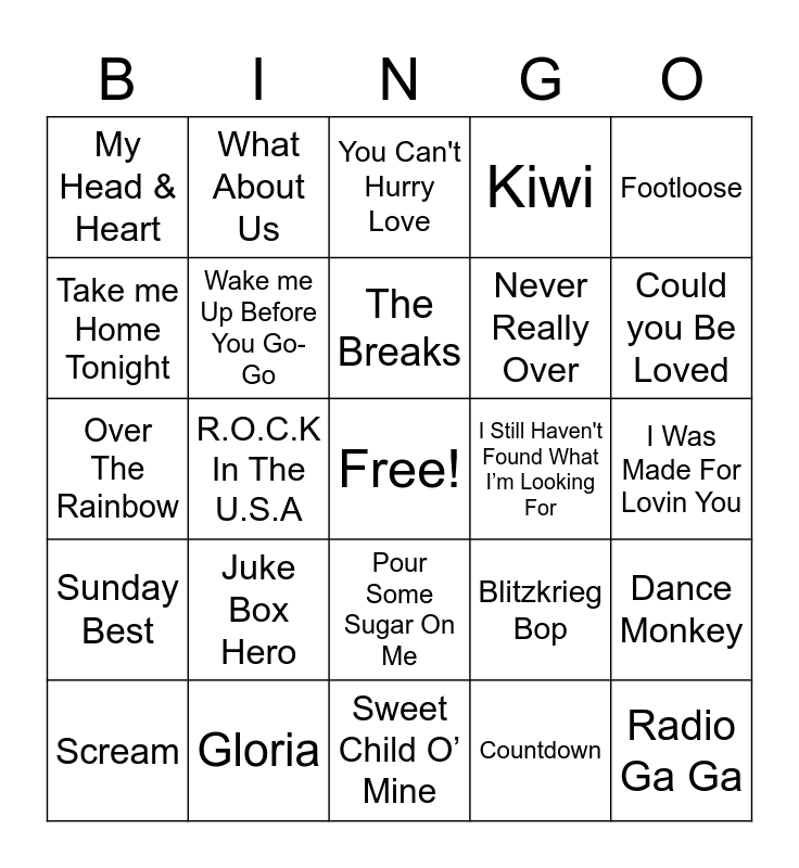 This bingo card has a free space and 68 words: We’re Not gonna Take It, Radio Ga Ga, Nails, Hair ,Hips, Heels, She's A Bad Mama Jama, Barbra Streisand, Heads Will Roll, What About Us, All- American Girl, The Breaks, Ladies Choice, Pour Some Sugar On Me, Same Ol’ Situation ( S.O.S), I Was Made For Lovin You, Footloose, Rock Of Ages, Take me Home Tonight, R.O.C.K In The U.S.A, My Head & Heart, Hold Me Closer, Juke Box Hero, Never Really Over, Blitzkrieg Bop, Sunday Best, I’m Yours, Ain’t No Rest For The Wicked, Here Comes The Sun, I Don’t Care, Ho Hey, Dance Monkey, Jump, You Can't Hurry Love, Nutbush City Limits, Long Haired Country Boy, Dancing Queen, Kiwi, Adore You, Wanna Be Startin’ Somethin’, Scream, Could you Be Loved, Over The Rainbow, Piano, Shout It Out Loud, Wake me Up Before You Go-Go, Hair Of A Dog, Easy Come Easy Go, Rock You Like A Hurricane, Every Rose Has It’s Thorn, It’s Time, I Still Haven't Found What I’m Looking For, Gloria, Dancing On The Ceiling, Let's Hear It For The Boys, Problem, Sweet Child O’ Mine, Whip My Hair, Pon De Replay, Countdown, Made You Look, Proud Mary, Karma Chameleon, Kiss, Freedom!90, Dressed For Success, Son Of A Preacher Man, Who's Loving You, Hair, 2 Be Loved ( Am I ready) and Maybe You're The Problem.