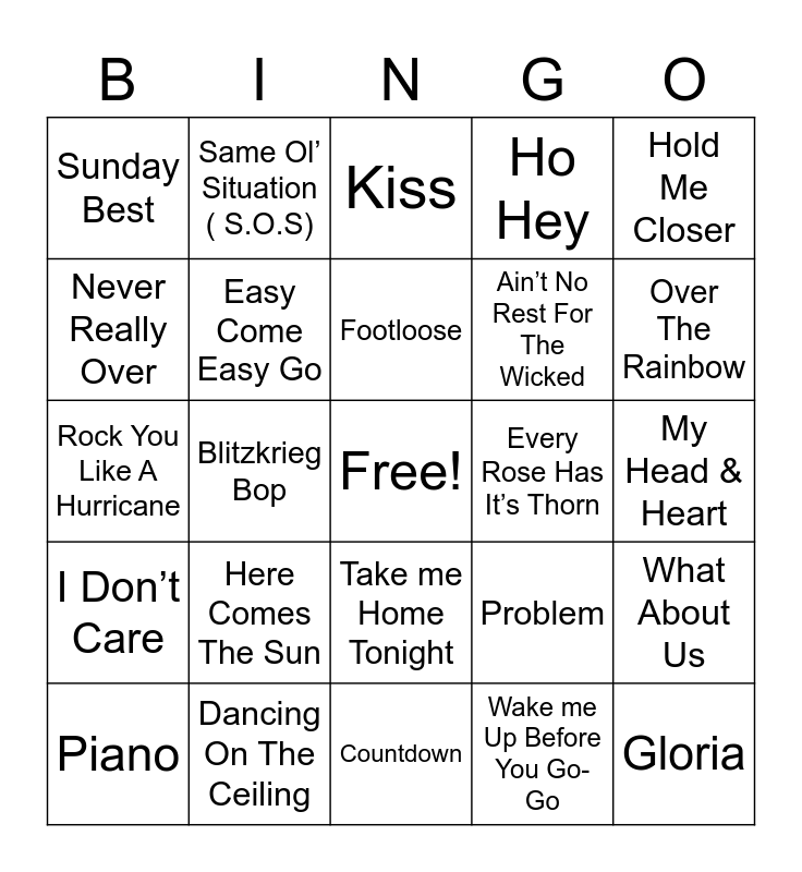 This bingo card has a free space and 63 words: She's A Bad Mama Jama, Barbra Streisand, Heads Will Roll, What About Us, Ladies Choice, Pour Some Sugar On Me, Same Ol’ Situation ( S.O.S), I Was Made For Lovin You, Footloose, Rock Of Ages, Take me Home Tonight, R.O.C.K In The U.S.A, My Head & Heart, Hold Me Closer, Juke Box Hero, Never Really Over, Blitzkrieg Bop, Sunday Best, I’m Yours, Ain’t No Rest For The Wicked, Here Comes The Sun, I Don’t Care, Ho Hey, Dance Monkey, Jump, You Can't Hurry Love, Nutbush City Limits, Long Haired Country Boy, Dancing Queen, Kiwi, Adore You, Wanna Be Startin’ Somethin’, Scream, Could you Be Loved, Over The Rainbow, Piano, Shout It Out Loud, Wake me Up Before You Go-Go, Hair Of A Dog, Easy Come Easy Go, Rock You Like A Hurricane, Every Rose Has It’s Thorn, It’s Time, I Still Haven't Found What I’m Looking For, Gloria, Dancing On The Ceiling, Let's Hear It For The Boys, Problem, Sweet Child O’ Mine, Whip My Hair, Pon De Replay, Countdown, Made You Look, Proud Mary, Karma Chameleon, Kiss, Freedom!90, Dressed For Success, Son Of A Preacher Man, Whos Loving You, Hair, 2 Be Loved ( Am I ready) and Maybe You're The Problem.