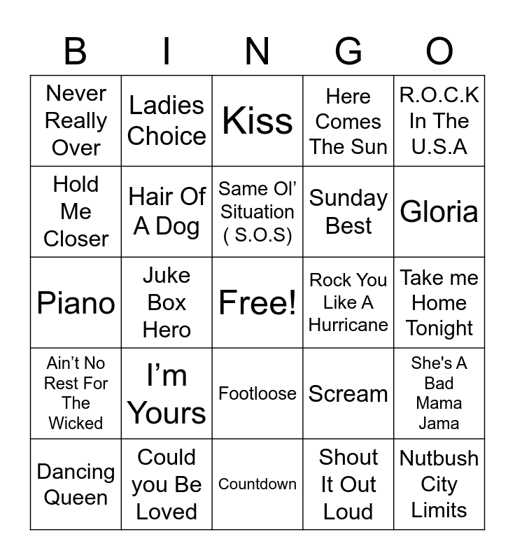 This bingo card has a free space and 65 words: We’re Not gonna Take It, Radio Ga Ga, Nails, Hair ,Hips, Heels, She's A Bad Mama Jama, All- American Girl, The Breaks, Ladies Choice, Pour Some Sugar On Me, Same Ol’ Situation ( S.O.S), I Was Made For Lovin You, Footloose, Rock Of Ages, Take me Home Tonight, R.O.C.K In The U.S.A, My Head & Heart, Hold Me Closer, Juke Box Hero, Never Really Over, Blitzkrieg Bop, Sunday Best, I’m Yours, Ain’t No Rest For The Wicked, Here Comes The Sun, I Don’t Care, Ho Hey, Dance Monkey, Jump, You Can't Hurry Love, Nutbush City Limits, Long Haired Country Boy, Dancing Queen, Kiwi, Adore You, Wanna Be Startin’ Somethin’, Scream, Could you Be Loved, Over The Rainbow, Piano, Shout It Out Loud, Wake me Up Before You Go-Go, Hair Of A Dog, Easy Come Easy Go, Rock You Like A Hurricane, Every Rose Has It’s Thorn, It’s Time, I Still Haven't Found What I’m Looking For, Gloria, Dancing On The Ceiling, Let's Hear It For The Boys, Problem, Sweet Child O’ Mine, Whip My Hair, Pon De Replay, Countdown, Made You Look, Proud Mary, Karma Chameleon, Kiss, Freedom!90, Dressed For Success, Son Of A Preacher Man, Whos Loving You, Hair, 2 Be Loved ( Am I ready) and Maybe You're The Problem.
