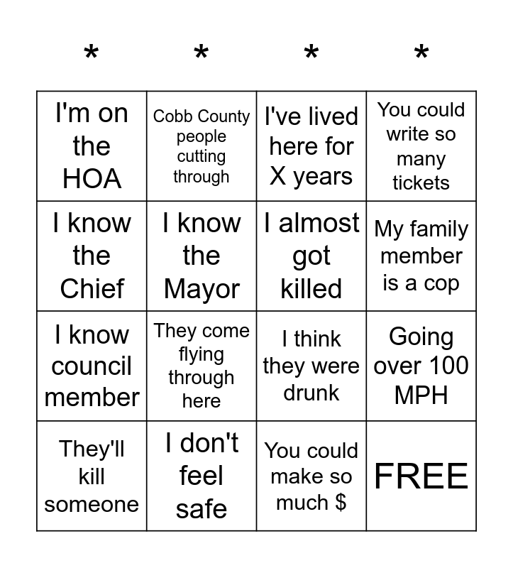This bingo card has 16 words: They'll kill someone, I don't feel safe, I've lived here for X years, You could write so many tickets, I know the Chief, Cobb County people cutting through, I think they were drunk, Going over 100 MPH, I'm on the HOA, I know the Mayor, You could make so much $, My family member is a cop, I know council member, They come flying through here, I almost got killed and FREE.