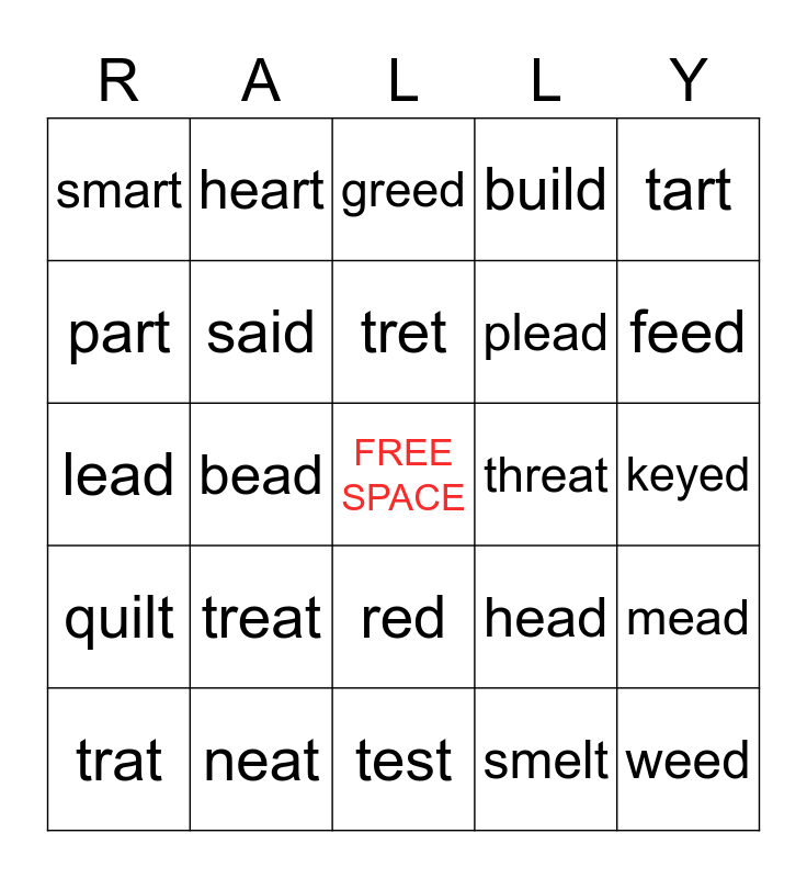 This bingo card has a free space and 25 words: treat, test, tret, trat, tart, smart, part, heart, threat, red, plead, lead, head, mead, said, need, keyed, greed, feed, bead, weed, neat, quilt, build and smelt.