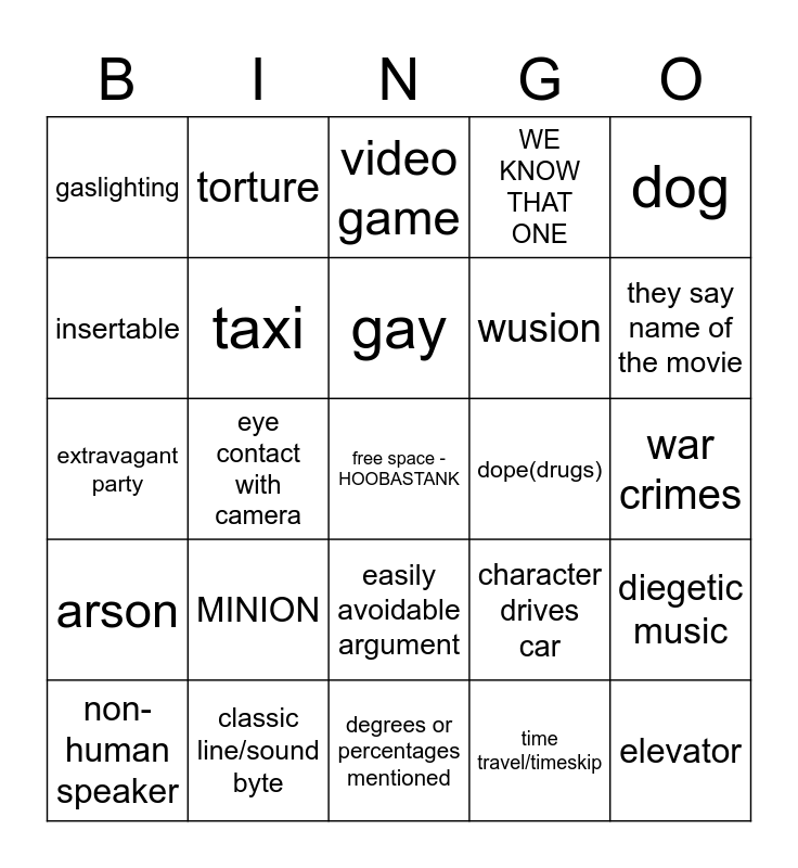 This bingo card has a free space and 26 words: easily avoidable argument, time travel/timeskip, gay, classic line/sound byte, dog, gaslighting, insertable, torture, war crimes, character drives car, wusion, extravagant party, diegetic music, non-human speaker, eye contact with camera, boom (continuity error), WE KNOW THAT ONE, arson, video game, elevator, they say name of the movie, degrees or percentages mentioned, dope(drugs), MINION, taxi and murder.