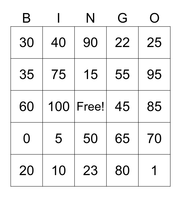 This bingo card has a free space and 24 words: 5, 10, 15, 20, 25, 30, 35, 40, 45, 50, 55, 60, 65, 70, 75, 80, 85, 90, 95, 100, 1, 0, 22 and 23.