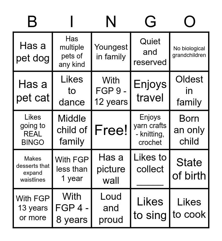 This bingo card has a free space and 24 words: With FGP less than 1 year, With FGP 4 - 8 years, With FGP 9 - 12 years, With FGP 13 years or more, No biological grandchildren, Has a pet dog, Has a pet cat, Has multiple pets of any kind, Enjoys yarn crafts - knitting, crochet, Has a picture wall, Enjoys travel, Likes going to REAL BINGO, Likes to collect _____, State of birth, Likes to dance, Likes to sing, Born an only child, Youngest in family, Oldest in family, Middle child of family, Likes to cook, Makes desserts that expand waistlines, Quiet and reserved and Loud and proud.