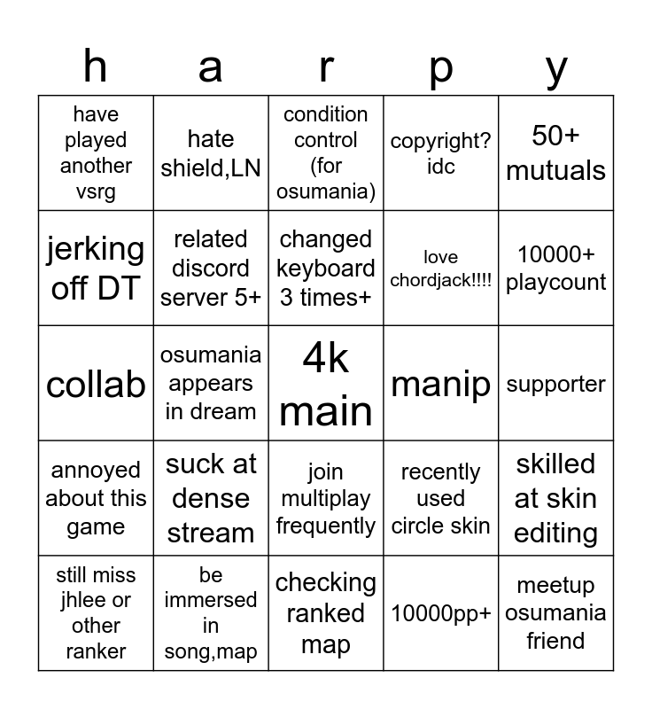 This bingo card has a free space and 24 words: suck at dense stream, be immersed in song,map, changed keyboard 3 times+, still miss jhlee or other ranker, 50+ mutuals, have played another vsrg, jerking off DT, hate shield,LN, manip, join multiplay frequently, love chordjack!!!!, collab, recently used circle skin, skilled at skin editing, related discord server 5+, 10000pp+, supporter, condition control (for osumania), 10000+ playcount, osumania appears in dream, meetup osumania friend, annoyed about this game, copyright? idc and checking ranked map.
