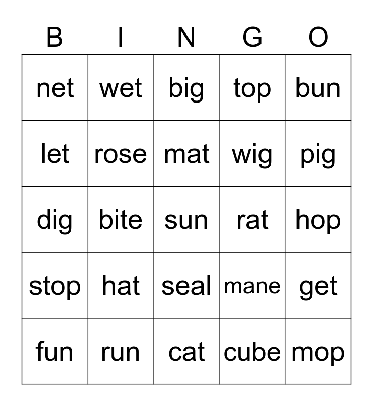 This bingo card has 25 words: hat, cat, mat, fun, bun, net, let, wet, rat, seal, wig, dig, mane, get, rose, mop, hop, big, pig, bite, sun, run, stop, top and cube.