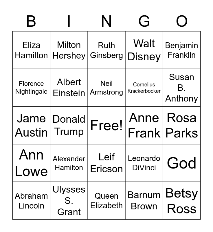 This bingo card has a free space and 29 words: Abraham Lincoln, John Adams, Donald Trump, Malcolm X, Eliza Hamilton, Ruth Ginsberg, Albert Einstein, Alexander Hamilton, Anne Frank, Ulysses S. Grant, Rosa Parks, Betsy Ross, Queen Elizabeth, Barnum Brown, Susan B. Anthony, Saint Kateri, Leif Ericson, Ann Lowe, Benjamin Franklin, Jame Austin, Leonardo DiVinci, Princess Diana, Cornelius Knickerbocker, Florence Nightingale, Walt Disney, Milton Hershey, God, Neil Armstrong and Sally Ride.
