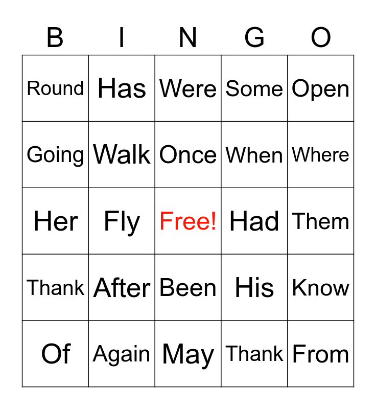 This bingo card has a free space and 24 words: After, Again, Once, Of, Open, Round, Going, Has, Had, Been, When, Her, His, Know, Walk, Thank, Them, Were, Where, Fly, From, Thank, Some and May.