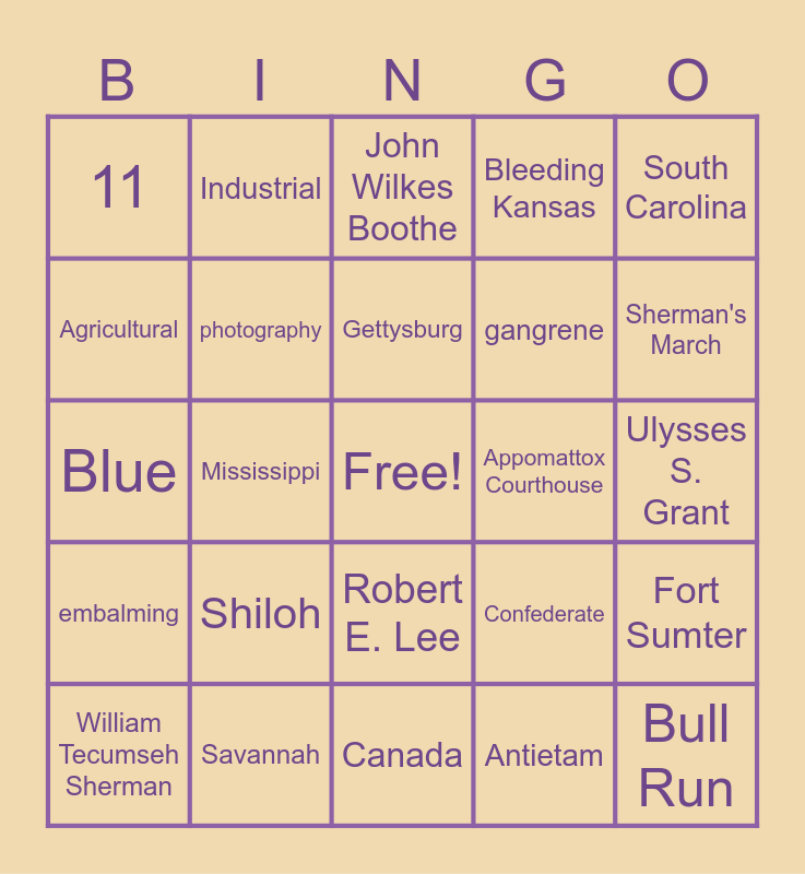 This bingo card has a free space and 42 words: Vicksburg, Gettysburg, Kansas-Nebraska Act, Shiloh, Antietam, Fort Sumter, Bull Run, Jefferson Davis, John Wilkes Boothe, Robert E. Lee, Ulysses S. Grant, Sherman's March, Mississippi, South Carolina, Mississippi River, Confederate, Grey, Blue, Virginia, Industrial, Agricultural, Rural, Urban, 11, Atlanta, Minie Ball, gangrene, Clara Barton, Telegraph, bromine, amputations, embalming, photography, Canada, Emancipation Proclamation, William Tecumseh Sherman, Savannah, Appomattox Courthouse, Derringer, 600, Bleeding Kansas and Maine.